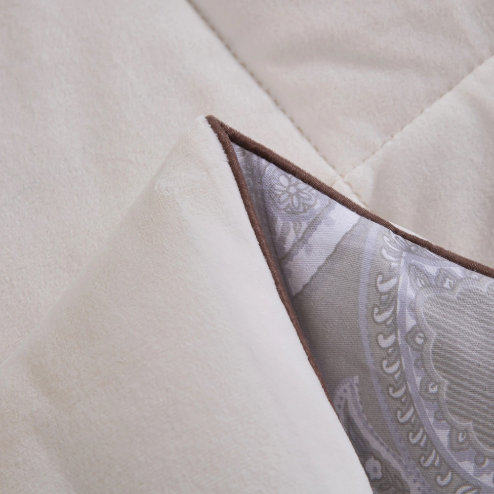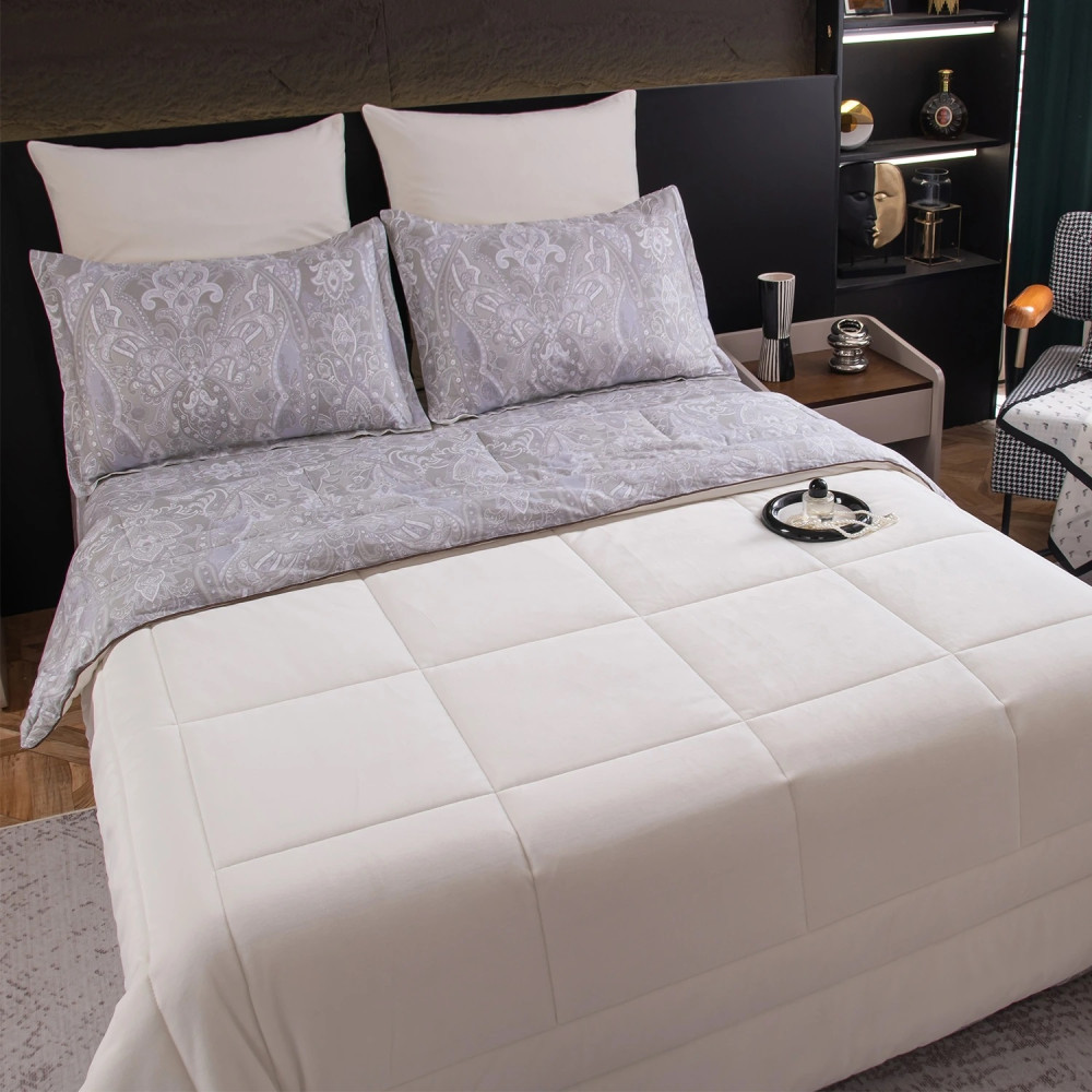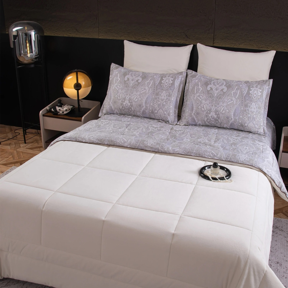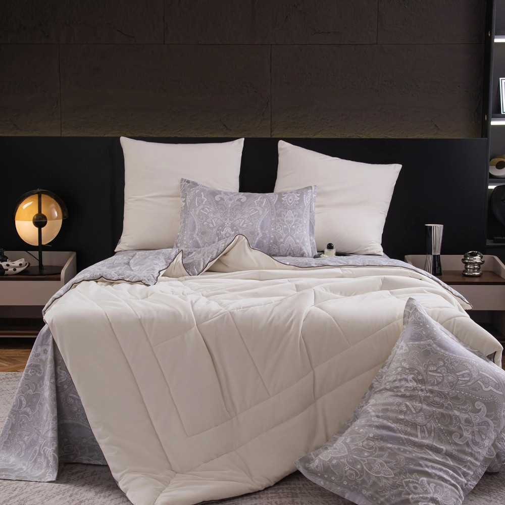 Одеяло выполнено с изысканной геометрической стёжкой и оформлено бархатным кантом. Верхняя сторона: мягкий велюр, придающий комплекту благородный вид и особую уютность, нижняя сторона: сатин из 100% хлопка, обеспечивающий естественную воздухопроницаемость и комфорт во время сна. Наполнитель: современное 100% эковолокно микрогель, лёгкое, гипоаллергенное и сохраняющее форму даже после многократных стирок. Зимой под таким одеялом тепло и уютно, а летом благодаря отличной циркуляции воздуха не будет жарко.