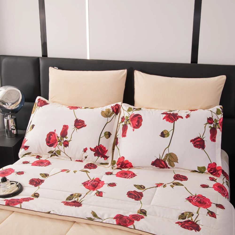 В комплект входят четыре наволочки: 50x70 см (2 шт) с запАхом (кармашком) выполнены из сатина 100% хлопка, с ушками и широким кантом по периметру; 70x70 см (2 шт) на молнии - верх из мягкого велюра, низ из сатина 100% хлопка, оформлены бархатным кантом.