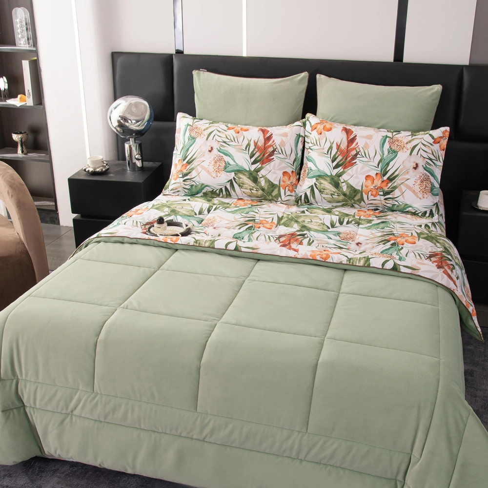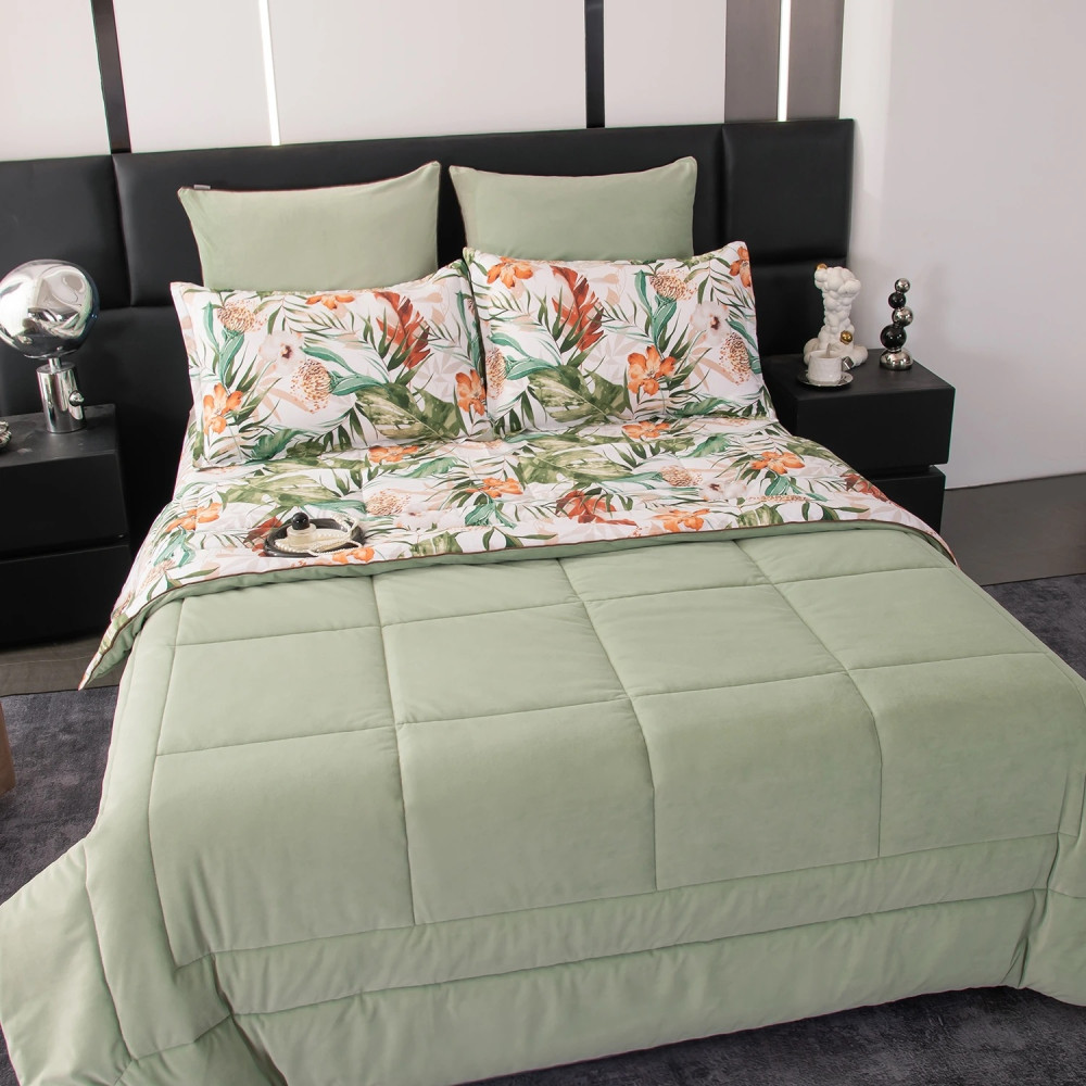 Одеяло выполнено с изысканной геометрической стёжкой и оформлено бархатным кантом. Верхняя сторона: мягкий велюр, придающий комплекту благородный вид и особую уютность, нижняя сторона: сатин из 100% хлопка, обеспечивающий естественную воздухопроницаемость и комфорт во время сна. Наполнитель: современное 100% эковолокно микрогель, лёгкое, гипоаллергенное и сохраняющее форму даже после многократных стирок. Зимой под таким одеялом тепло и уютно, а летом благодаря отличной циркуляции воздуха не будет жарко.