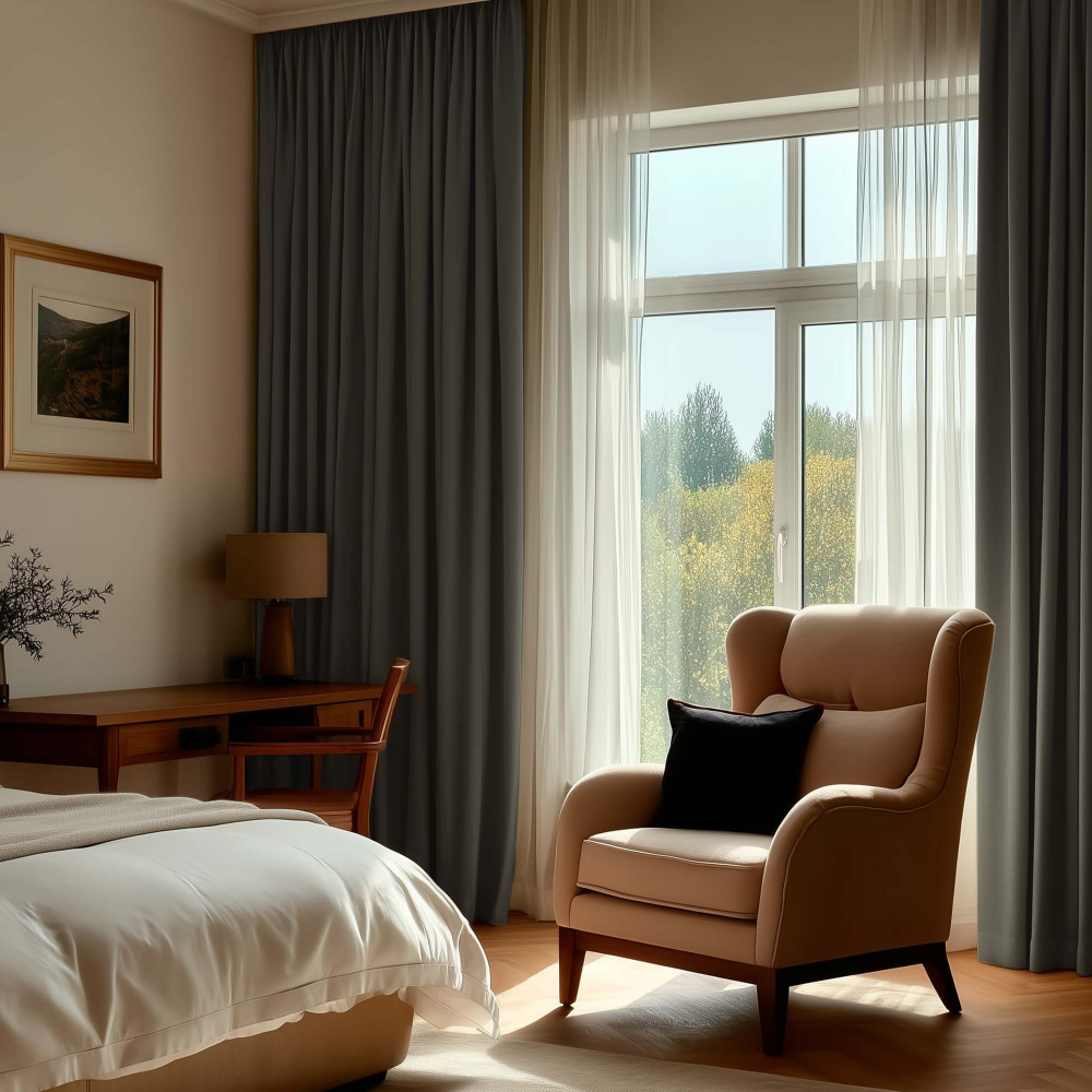 Комплект штор из плотной декоративной ткани блэкаут. Защита от солнца 100%. Шторы обеспечивают полное затемнение, даже при наличии прямого солнечного света. Состав 100% полиэстер. В комплекте 2 портьеры и подхваты. Вид крепления - шторная лента. Сделано в России.